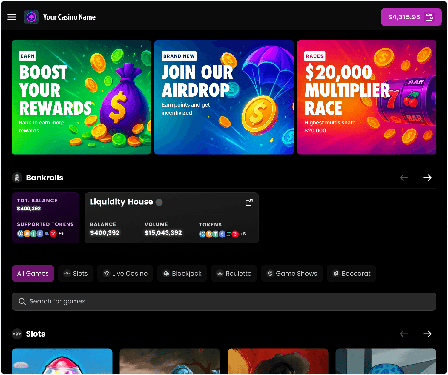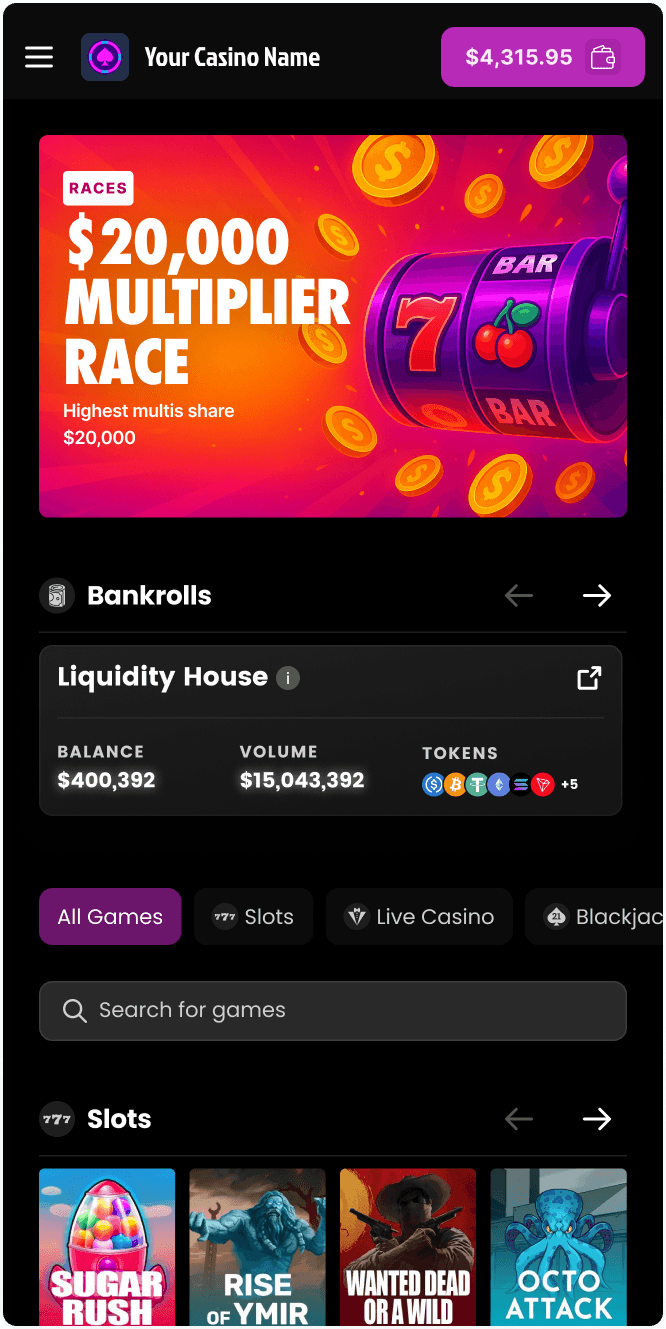 We empower anyone to build and scale their own casino by making it as simple as starting an online store—no barriers, no red tape. Just the tools for success. Your Shopify for casinos.