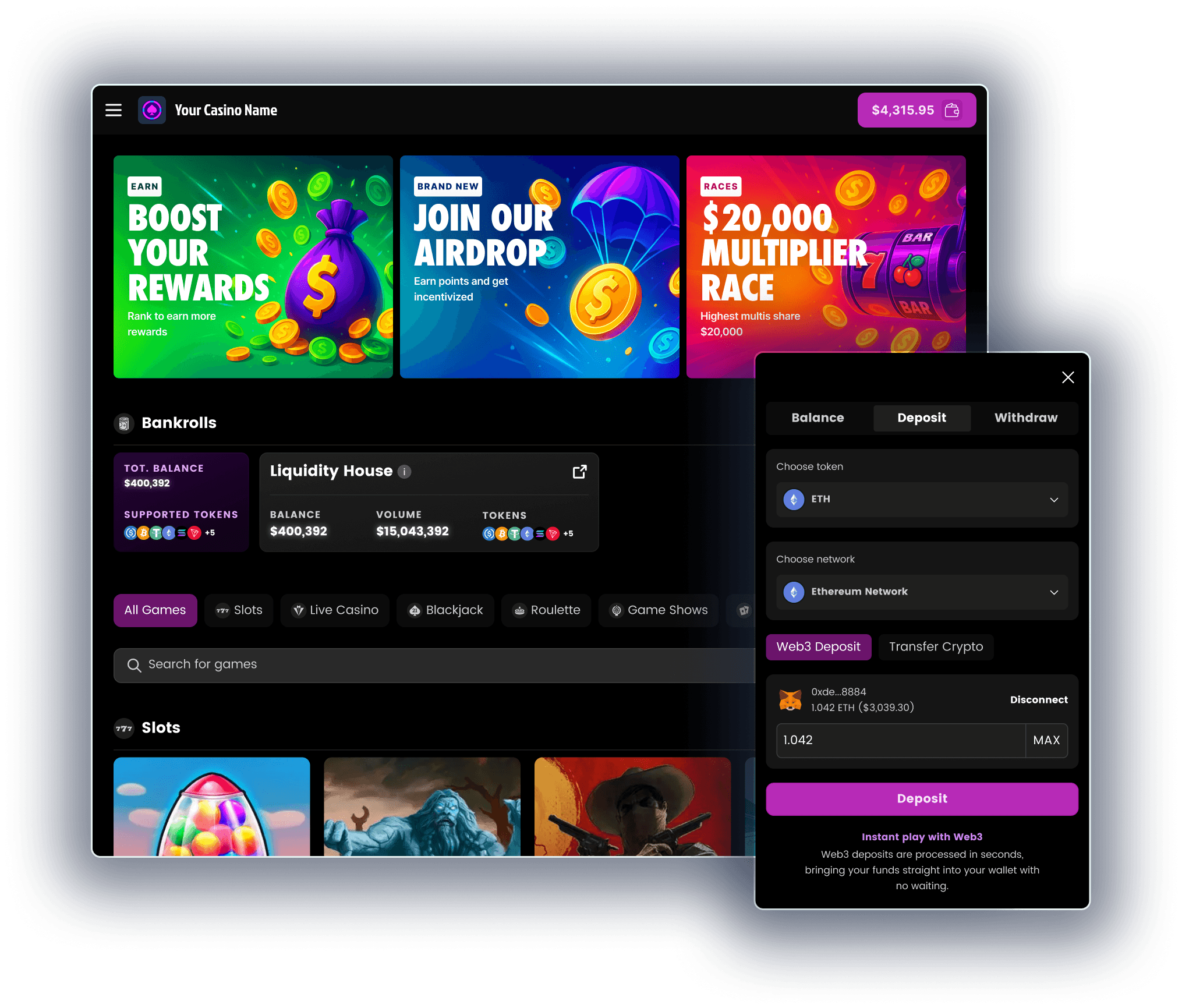 Your casino is fully hosted, licensed, and optimized for real-money play from day one. Accept crypto, track performance, and start generating revenue, right away!